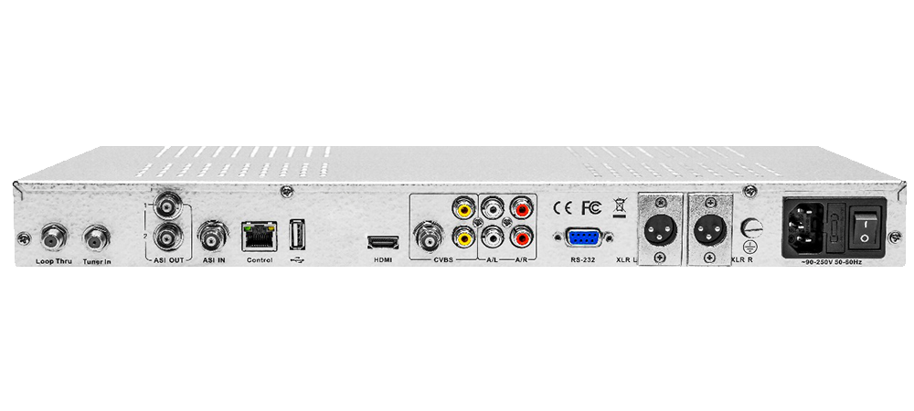 DVB-S/S2 демодулятор, 1 ВЧ вход с проходным выходом, два CI слота, декодер SD/HD MPEG-2, MPEG-4/H.264 и HEVC/H.265, видеовыходы CVBS/HDMI, аудиовыходы RCA/AES, MPEG-TS выходы ASI, один блок питания 220 В