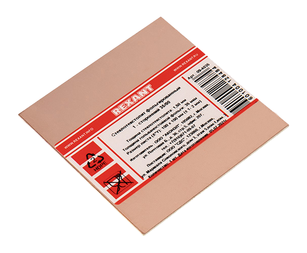 Стеклотекстолит односторонний 100 х 100 х 1.5 мм, 35 мкм, Rexant - представляет собой композицию стеклоткани и связующего материала на основе эпоксидных смол, а также с одной стороны покрытый медной электролитической гальваностойкой фольгой толщиной 35 мкм.